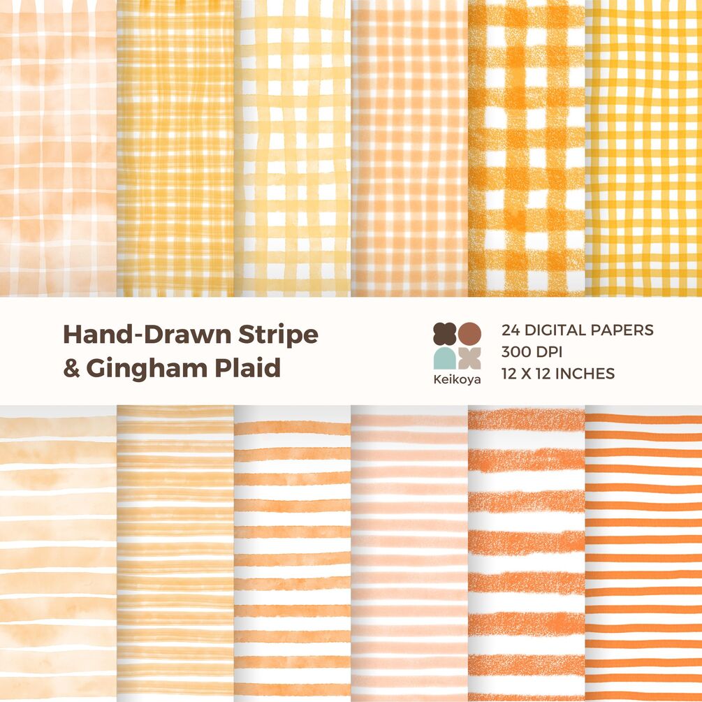 24 Hand-Drawn Digital Papers | Gingham Plaid & Stripe | Orange