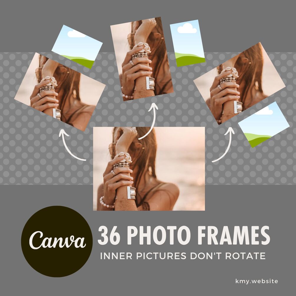 Set of 36 rectangle photo frames, aspect ratio 2:3 or 3:2, for Canva that do not rotate the photos inside. The frames were rotated by 5 degrees.